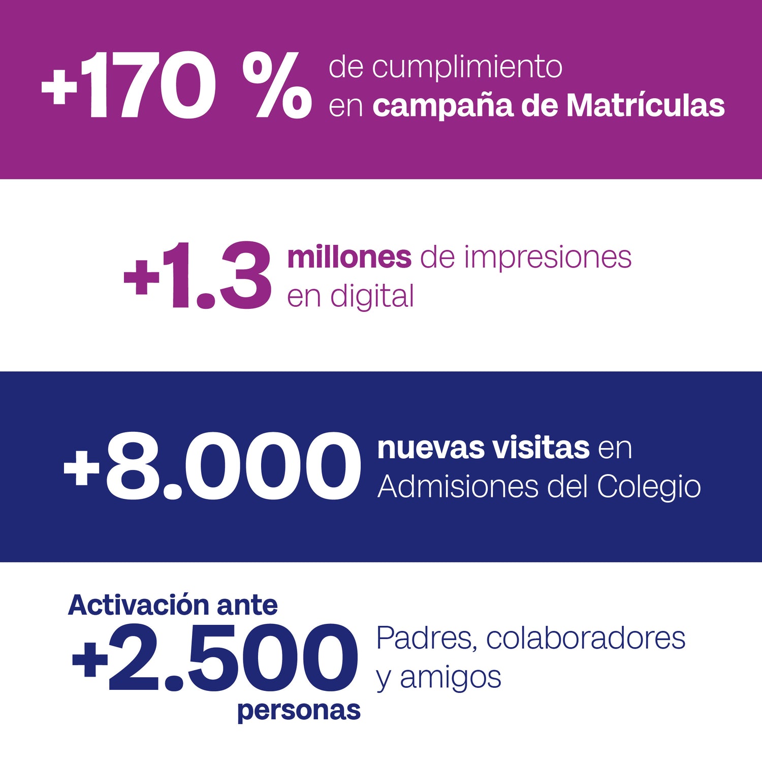 Con el lanzamiento de la estrategia y la campaña de mercadeo alcanzamos resultados que no solo fueron simbólicos, sino que también aportaron a la temporada de matrículas que continuaba inmediatamente después. De esta manera, podríamos darle la bienvenida a los primeros estudiantes niños del colegio.